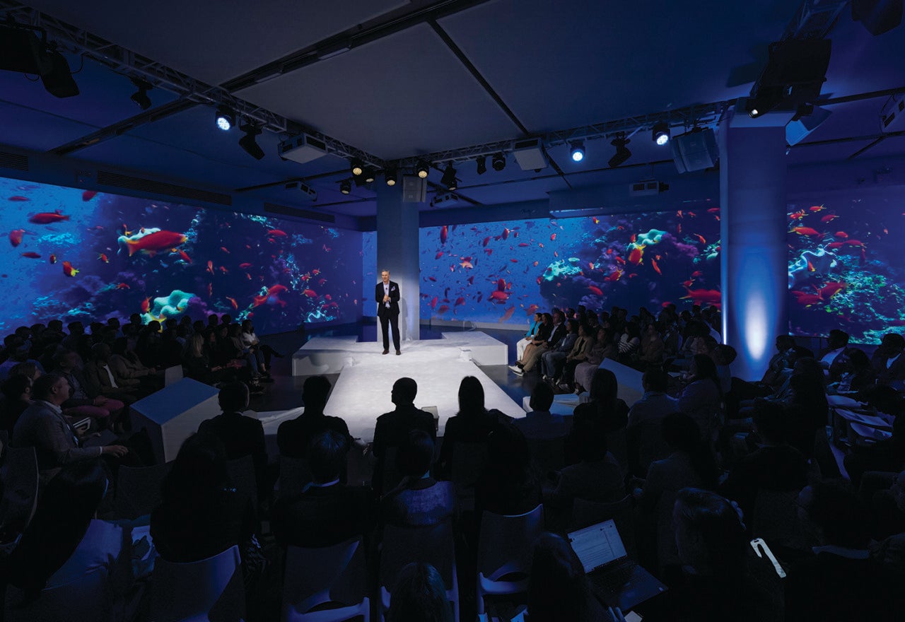 We filled the walls with logos, maps, lifestyle shots, and tons of videos. We even put the audience underwater when it was time to show off Samsung’s “Ocean Vibes” offering.