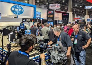 With the aftermarket industry all about doing, static exhibits were not getting much love at this show. Successful spaces leveraged hands-on experiences (and open bars). Demos of all kinds, especially wrapping and restoration, featuring models and actors, gathered crowds. Learning was powerful: cue in Legacy EV that set up their exhibit around the steps of making any vehicle electric. To drive their point, they brought a 1930 Dodge COE with a charging connector in its hood. Celebrity appearances were stopping traffic and creating opportunities for brands to capture content. EMPI, a parts supplier, for example, had a happening space with guest appearances by Blake Wilkey, a pro offroad racer, and Chip Foose, a TV personality and auto designer. Professional cameras, and attendees’ cellphones, kept on rolling.