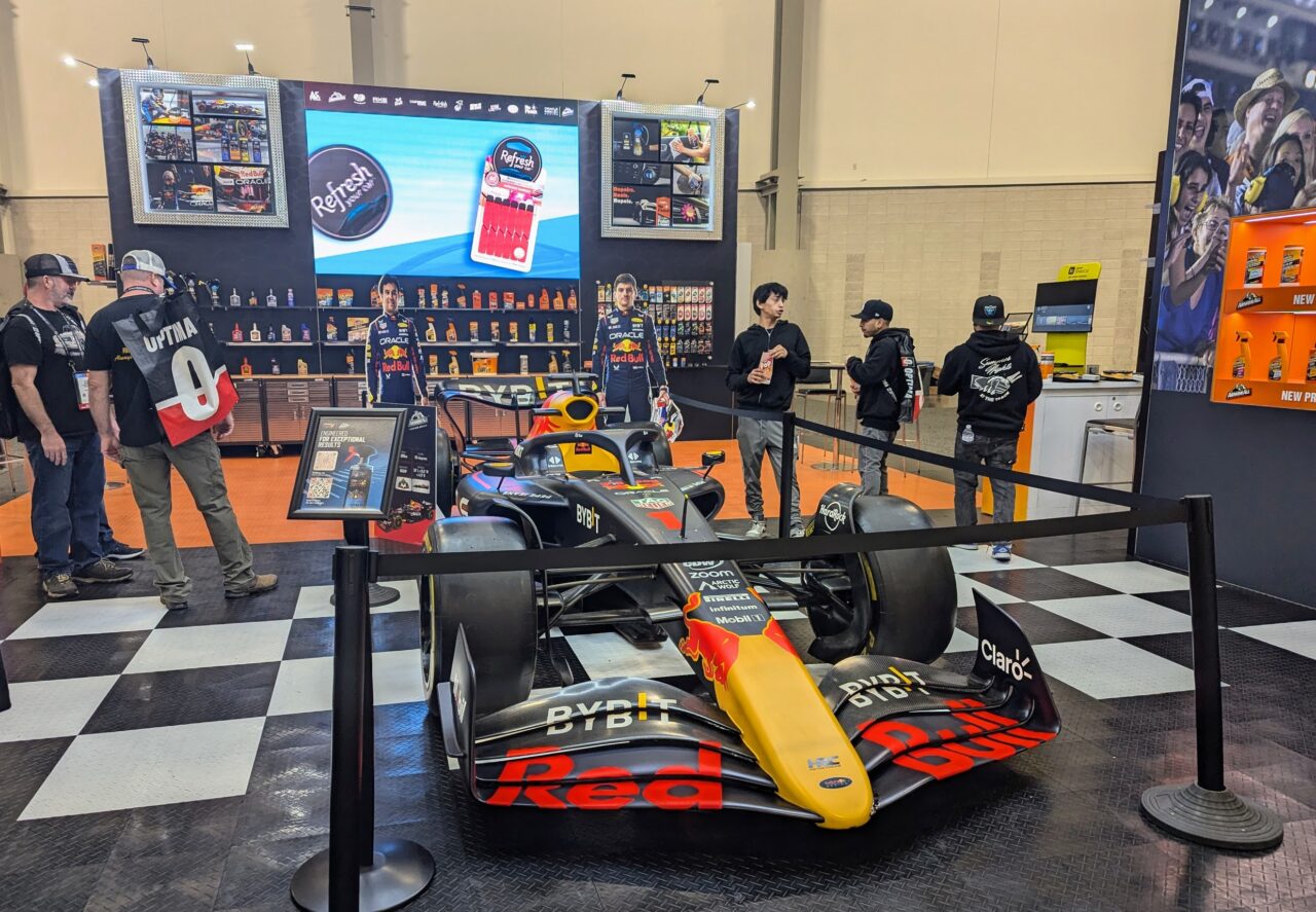 Dramatic and unusual flooring surfaces set the stage at SEMA, ranging from bright and bold to highly functional to glamorous. Automotive care brand Armor All placed The Red Bull Racing RB18 race car on the appropriately checkered floor with the rest of the exhibit floor brand-orange, creating an exciting space telling a cohesive story.