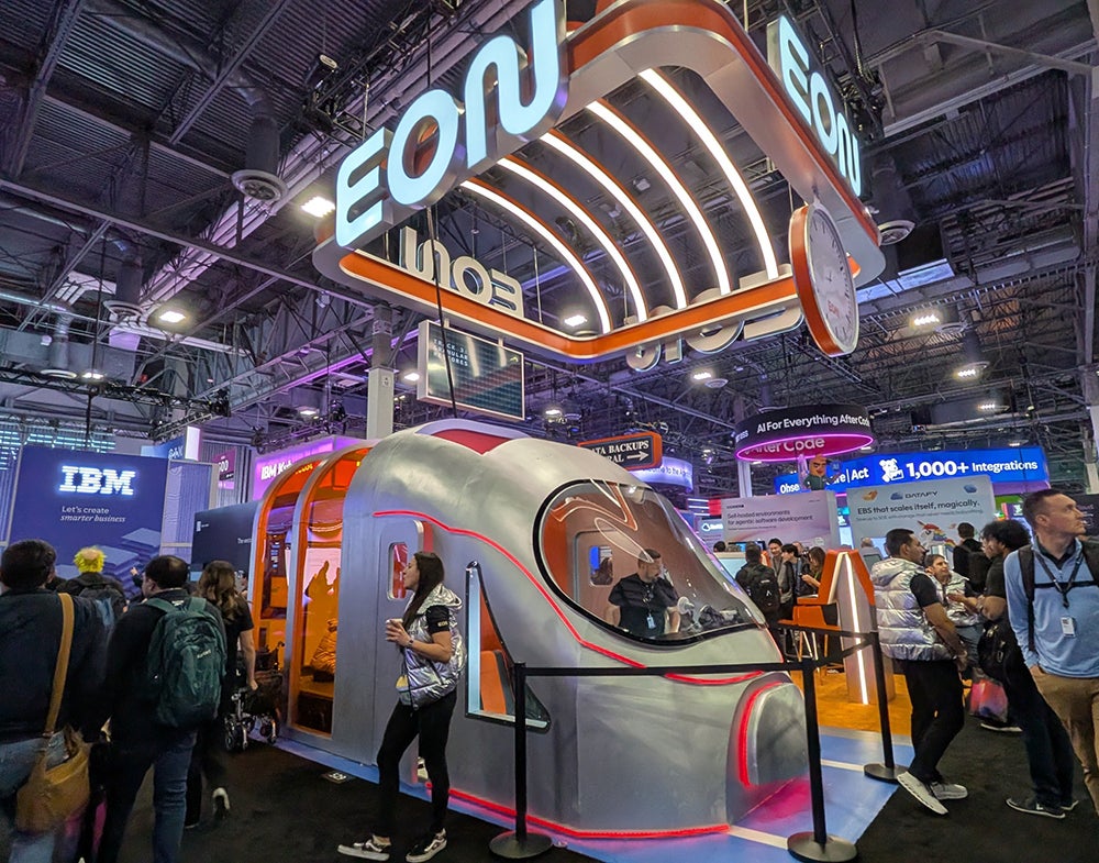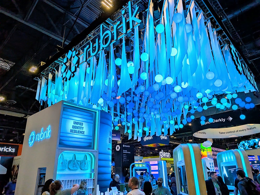 Floating kinetic orbs and cascading fabric ribbons drew attention across the aisles to Rubrik’s booth, providing a visually engaging representation of the Rubrik Agent Cloud, the newest offering by the cybersecurity company. Under the canopy, sleek product stations anchored the narrative in practical outcomes. (Design and Build: Impact XM)