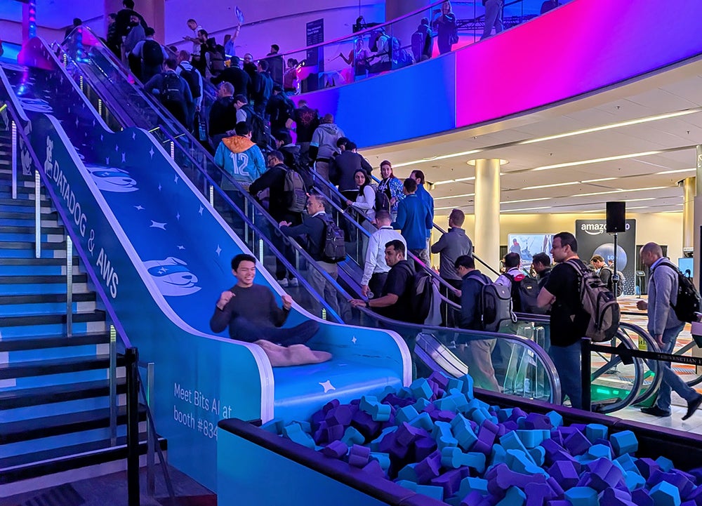 Cloud-scale observability platform Datadog had two booths on the floor where attendees could explore its AI-powered products, but before they ever got there, they didn’t miss their chance to skip the escalator and take that slide because sometimes the fastest path to insight is also the most fun.