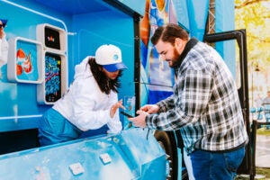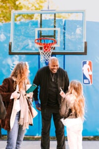 On the exterior, two motorized hoops featuring adjustable heights, which were first introduced last year at NBA All-Star Weekend, provide fans of any age or stature the chance to live out their “dunk dreams.” There’s also a mini “shop” where attendees can score limited-edition merchandise created by local artists, another 2K gaming zone, seating, and at most stops, the opportunity to interact with past and present NBA players, as well as team mascots and dance squads.