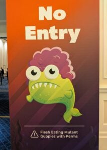 No Entry. Flesh Eating Mutant Guppies with Perms said a sign on the door next to Registration at HLTH USA 2025 that took place at the Venetian Expo Center in Las Vegas, Oct. 19-22. What you wanted was the door where Petunia, the unicorn mascot, was sprinkling magic dust.
