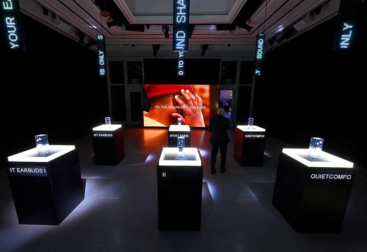 Next, attendees entered a drastically different space: a dark, quiet room where Bose team members greeted everyone and discussed the new earbuds. But it wasn’t long before custom-fabricated stands displaying the product began to illuminate and a large LED screen displayed branded content, signifying the official reveal moment. The entire spectacle was scripted to provide a genuinely theatrical experience.