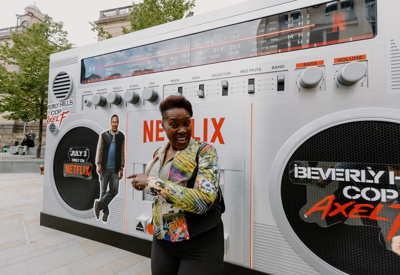 Netflix is pumping up the jams and the ’80s nostalgia across the UK with larger-than-life boombox installations designed to tout its film “Beverly Hills Cop: Axel F,” which debuts July 3. A 50-foot retro boombox was planted in Edinburgh on June 22, in London from June 29-30 and will make its way to Manchester on July 6. The brand leveraged the oversized stereos to broadcast iconic music from the original 1984 “Beverly Hills Cop” film in a bid to create an emotional connection between the new movie and the ’80s hit. No disturbing the peace here. (Agency: Allied Global Marketing)