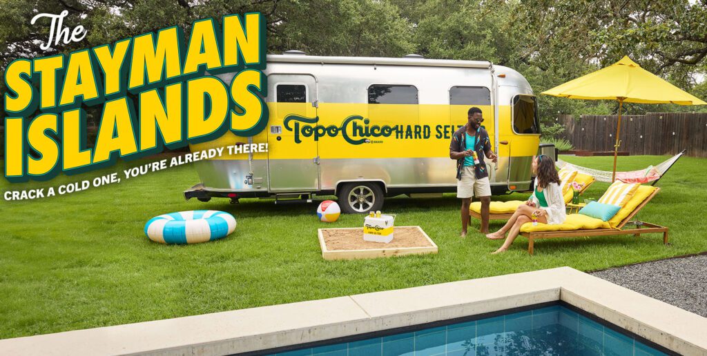 As part of a summer-long partnership, Topo teamed up with Airstream on the campaign to offer one contest winner (over the age of 21) a three-day, two-night experience at “The Stayman Islands”—their own backyard, transformed into a vacation destination. Picture it: sand, plush lounge recliners, spa treatments, a gourmet chef-curated dinner, live music entertainment and, naturally, a private Airstream trailer to sleep in. Kind of reminds us of the reverse activations that took place in the early days of the pandemic.