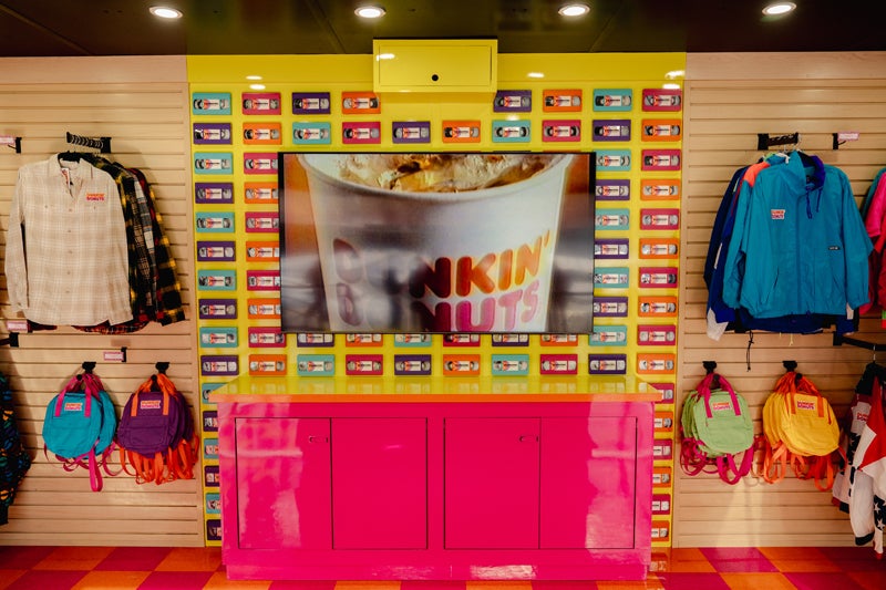 The pop-up (and the ad) harkened back to 1995, when Dunkin’ first shined a spotlight on its iced coffee, and the old-school items in the brand’s capsule collection perfectly captured the era. The authentic vintage, and ’90s-inspired, apparel that was up for purchase included branded bucket hats, overalls, flannel shirts, fanny packs and “Cosby” sweaters (IYKYK). Plus, everyone who bought an item scored a $5 Dunkin’ gift card.