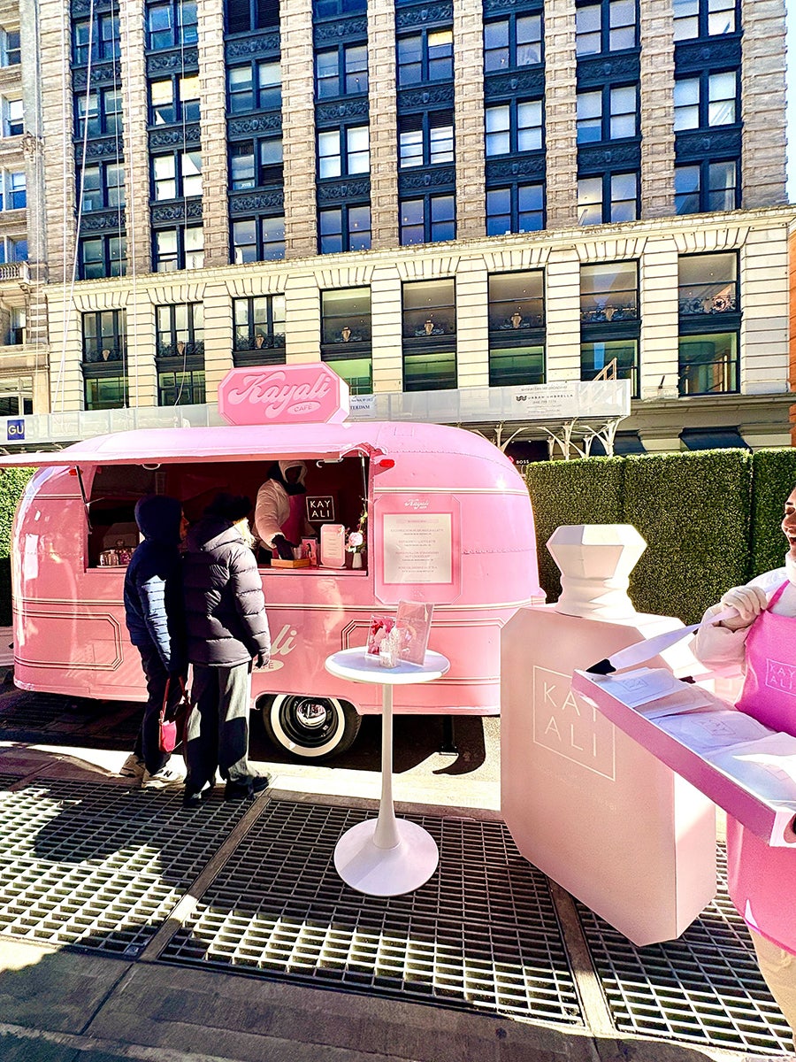 Between Galentine’s Day, Valentine’s Day and New York Fashion Week, Kayali’s charming mobile café, which popped up in Manhattan from Feb. 13-14, was in the right place at the right time. The fragrance brand parked its pink Airstream trailer near a Sephora location in SoHo, where apron-clad ambassadors served beverages inspired by its “gourmand fragrance universe.”