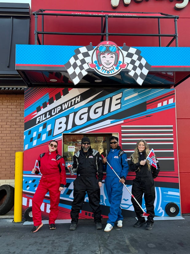 Visitors were first greeted with a tire-shaped archway that welcomed them to the Wendy’s Speedway for the “Biggie 500,” as well as a flag stand installation. From there, the replica racetrack experience was complete with stop lights, ambassadors waving flags and a full pit crew that washed fans’ car windshields and shined their tires, delivering the full pit stop treatment.