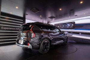 The centerpiece of the experience inside was an immersive test-drive simulation. Attendees hopped into the seats of an actual EV9 as first-person perspective 3D video displayed on the screens and created the sensation of driving as the vehicle rotated on a turntable. The approximately 15-minute experience walked attendees through Kia in-vehicle tech, like Highway Driving Assist 2 and Remote Smart Parking Assist 2, as narrators described the technology. It was effective and certainly less pressure (and commitment) than a traditional test drive experience for an attendee base obsessed with the technology pieces of it all.