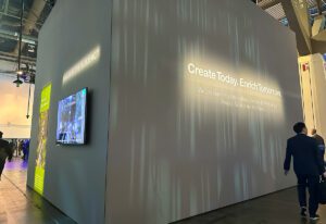 Has that same footprint since before some of our interns were born. A curved LED wall and high, sweeping curtains framed the entrance to Panasonic’s booth in its usual real estate on the showfloor. Neutral tones, mirrors and lighting play, from projections on the curtains to projected signage, caught our attention. These were, in fact, intentional choices by the brand as part of its Green Impact initiative, and much of the booth incorporated environmentally friendly tactics, from less building materials and carpeting, to leveraging booth joints made from “high concentration cellulose fiber molding material ‘kinari'” in its display tables, which will be used in future exhibit experiences, too. A sustainable energy-themed 3D city on a media table rotated through content, while nearby attendees got an up-close look at green hydrogen production components and how Panasonic is embracing it. Attendees loved the mist created in the Nanoe Moisture+ zone within curtained showcases. Analog moments, like a voting station for attendees to decide what advancements will have the most impact in the future using kinari coins, was a departure from years of digital “touch” engagements. (Partner: Czarnowski)