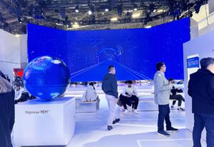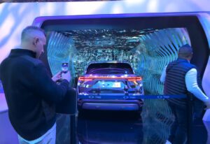 The 21,600-square-foot Hyundai booth, its largest yet, featured a fortress-like exterior and literal journey inside through hydrogen “software-define vehicle” innovations and AI technologies aimed at creating a “safe and free” future. What might be described as a vision board greeted attendees as they entered through the massively high gates (indeed, there was a long queue, but the reservation system reportedly worked well). Wall-to-wall LED displays outlined the brand’s plan to achieve carbon neutrality by 2045. Because of the timed entry, attendees could freely and comfortably explore other exhibits in the space including a full-on demo of a hydrogen fuel cell tram on “tracks” for environmentally friendly public transformation. (Partner: Astound Group)