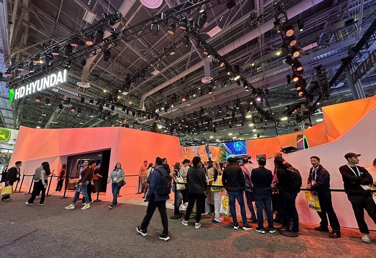 If the orange glow from the circular booth facade of the HD Hyundai booth didn’t draw you in, the badass, 15-foot-tall AI-powered Concept X excavator positioned on the main stage that moved back and forth on a track during presentations on a massive LED wall behind it, certainly did. Crag-like shapes and projections were designed to make the exhibit feel like a futuristic construction site. The main attraction (aside from Concept X) was a “VR Twin Fun Ride” that helped attendees visualize future work sites powered by HD Hyundai innovations and had them rotating in all directions. Attendees could also remotely control equipment within the “Twin Xite” zone using a simulator that showcased tech that allows operators to analyze their loads’ “see-through” metal buckets using sensors and cameras. We loved the extra-large tiered bench seating overlooking the footprint, which was a magnet for floor-weary attendees. (Partner: MC2)
