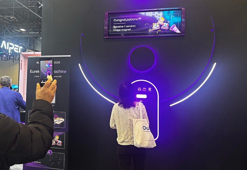 Eureka at The Venetian Expo had attendees lined up for a larger-than-life slot machine experience, where they pulled a lever to claim deep discounts and prizes—and even free machines. All attendees had to do (as with many swag stations) was follow the brand on Instagram.