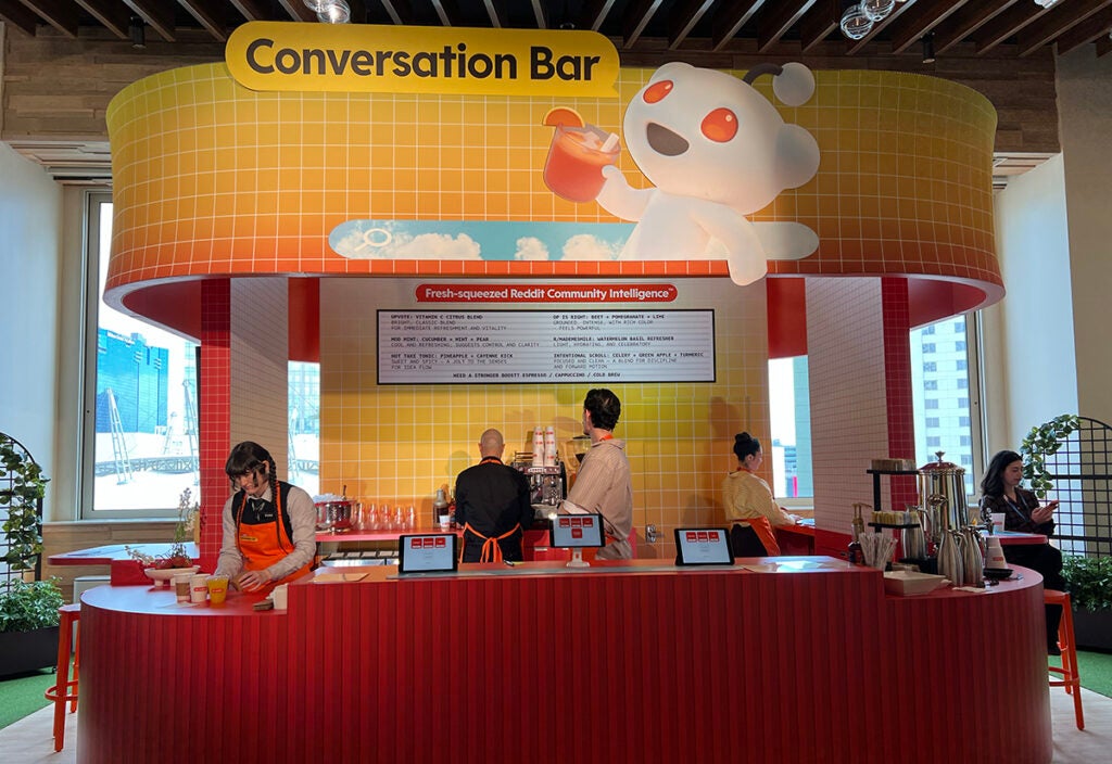 Coffee bars are a dime a dozen around the LVCC and hotels, so Reddit is instead opting for juice and elevating the experience with a little personalization at the Conversation Bar. At a tablet, attendees explore Reddit conversations and choose their focus for 2026: purpose, energy, balance, creativity or joy. Their choice then influences their drink order at the bar that’s serving up “fresh-squeezed Reddit community intelligence.” Joy landed us a refreshing watermelon juice. At the Gift Bar, participants can then order a customized glass tumbler with their initials, two focus icons and a Reddit icon.