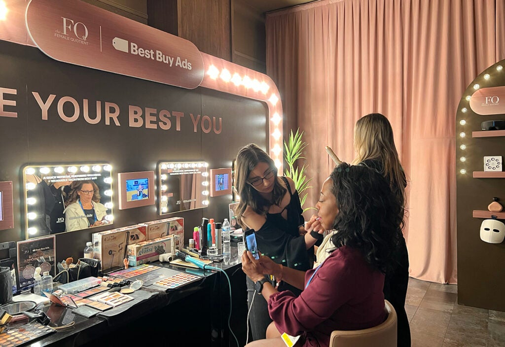 Headshot studios are always popular at conferences, giving attendees the chance to update their professional looks, but it’s rare to also have an accompanying glam bar. At The Female Quotient Lounge, Best Buy Ads hosted a makeup and hair styling bar for attendees to get touched up before getting their photos taken in front of a pink draped backdrop or heading back out to the show floor. The illuminated vanity featured “Be Your Best You” messaging, and attendees were very excited to see their glow-up in the mirror and snap selfies.