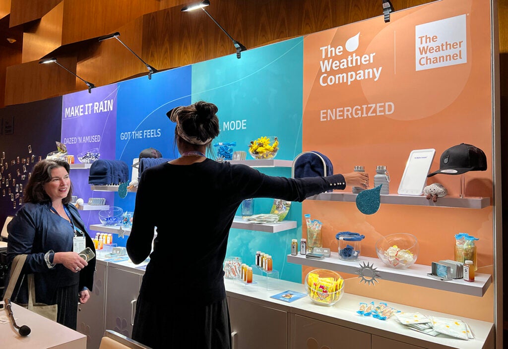 The Weather Company at Aria popped up a “Plinko”-style game called “The Drop,” where attendees climb steps to drop discs into one of nine slots and watch it trickle to the bottom. The icon of the slot the disc lands in determines the prize they receive. We got the moon icon, so we chose a small cloud plushie from the “Make It Rain” prize wall. (Agency: Seen Presents)