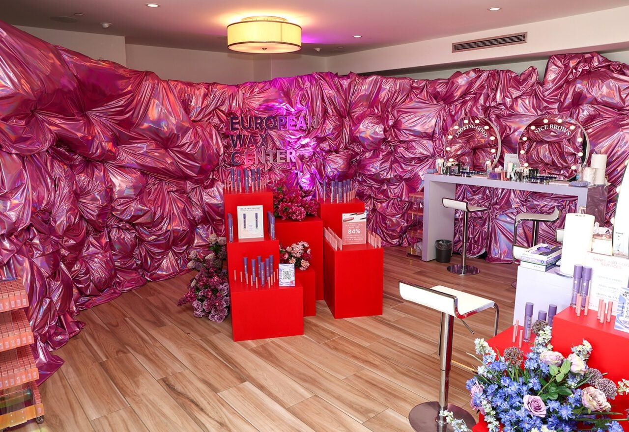 European Wax Center’s brow party brought a team of experts to style attendees’ brows from a selection of elevated, pearl or galactic brows—looks that fit right into the Coachella scene. After styling, participants took selfies in front of mirrors with “Looking Good” or “Nice Brows” text across the top and the space’s pink metallic puffy backdrop.