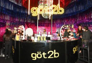 Göt2b refreshed hair looks inside a domed galactic-glam styling bar decked out in jewel-toned tinsel fringe, disco balls and neon signs. Participants could sit at one of several mirror stations set up around a circular island that was equipped with plenty of hair sprays, styling gels, hair clips and hair dye samples. SHEGLAM was also on-site to help attendees amp up or touch up their festival makeup inside a separate rainbow-themed dome. The ceiling was completely covered by psychedelic-patterned balloons, and the floor was made up of a grid of brightly lit multicolor 3D squares. Festivalgoers could sample lip, eye and face products displayed on a round glass table at the center of the space.