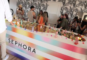 At Sephora’s “Spritz on a Vibe Shift” perfume activation, attendees could discover the color of their aura and test a variety of scents displayed on a large white table adorned with reflecting gold surfaces and crystal blocks and spheres. Once participants found their fragrance, they’d mist it onto a friendship bracelet, each embroidered with words like “harmony,” “love,” “create” and “fearless.” They could then take the bracelet to the poet on hand to inspire a custom poem written in real time.
