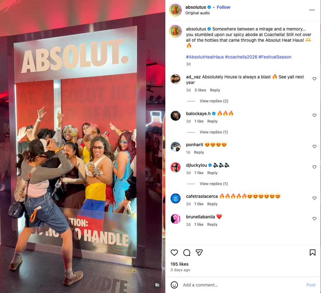 Longstanding Coachella sponsor Absolut returned as the festival’s official vodka with a Heat Haus experience that fired up attendees via red décor, live music, themed photo ops, and zesty cocktails, including Absolut Spicy Lemonade and Absolut Pina Picante Vodkarita. The brand, and its Absolut Tabasco varietal, also heated things up with the Absolut Hottest Brunch: Desert Edition in Palm Springs, which served up spicy cocktails and bites, and sizzling dj sets.