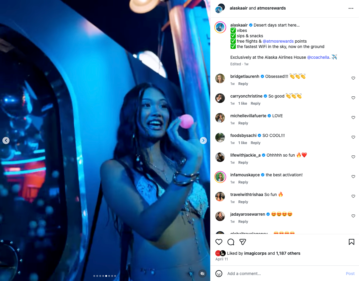 TOP TACTIC: The brand made a strong loyalty play. Its rewards members had access to a dedicated lounge and the “Cloud Social,” a daily happy hour event featuring refreshments and a chance to win premium prizes, including VIP festival upgrades and roundtrip tickets to and from anywhere Alaska flies, by grabbing a colorful orb from a lotto-ball-like machine.