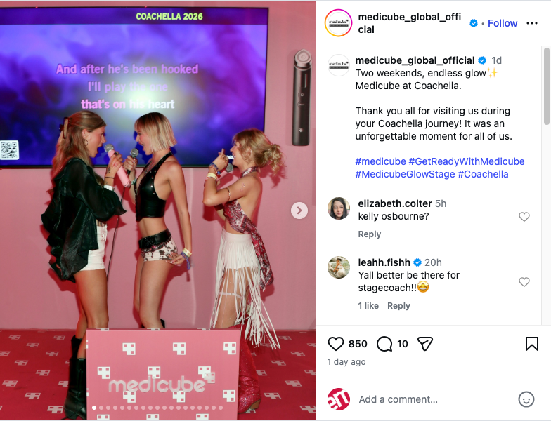 Korean skincare brand Medicube delivered its largest U.S. activation to date at Coachella 2026, which included a multiday experience on the grounds that was built to tout its hero device, the Booster Pro. The pink-infused setup included beauty touch-up stations where festivalgoers could test out the Booster Pro and other brand products, live dj sets, branded glow sticks, cocktails and photo moments. (Not to mention the off-site Medicube Glowtel Desert Oasis for influencers.)