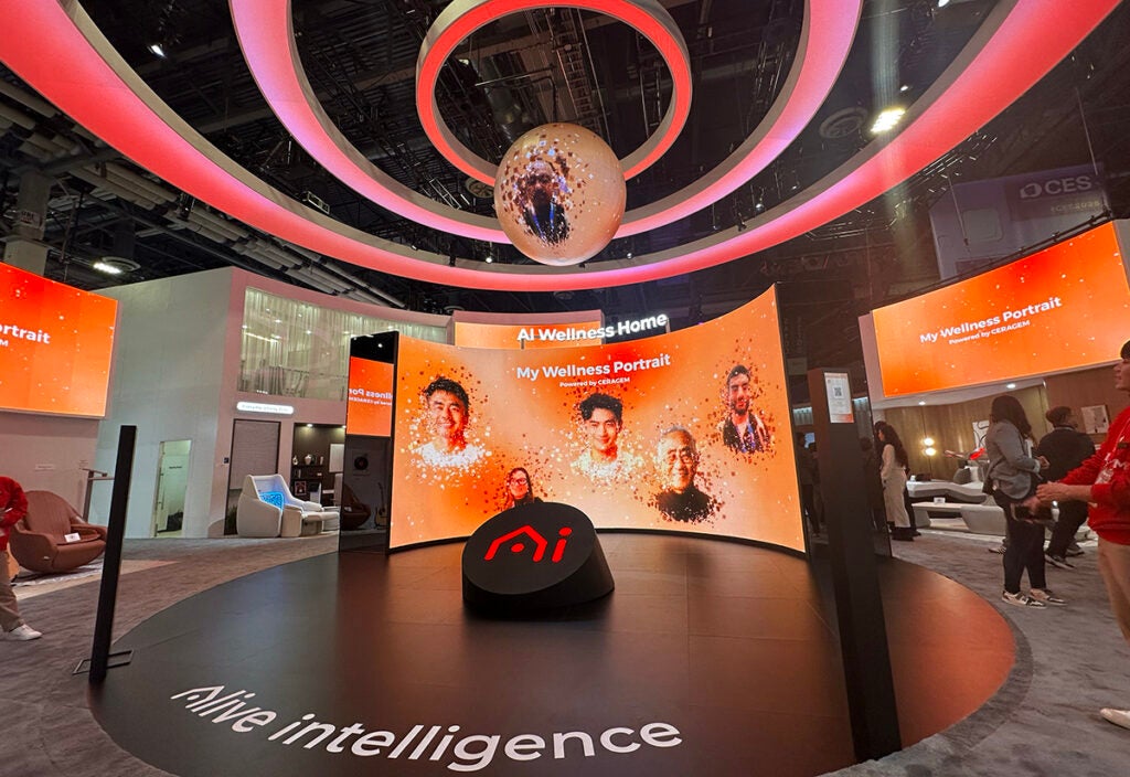 A recurring exhibitor and award-winner, the brand erected an “Alive Intelligence Wellness Home” experience showcasing health management integrated into daily living spaces. What immediately caught our attention was how it held our gaze—a full 180-degree view with two floors, a larger-than-life “My Wellness Portrait” AI photo activation that created a digital collage of our likeness and merged it into the “community,” and a quiet demo area for massage chairs behind translucent fabric that drove curiosity. Again, LEDs in sweeping shapes—including an LED disco ball overhead that powered the collages—and friendly booth staff all drove conversations around this space at The Venetian Expo.