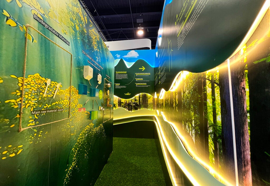 SCP Packaging arrived with a sustainable booth made out of recyclable cardboard and wood materials. The tree, animals and countertop in the center of the exhibit were fashioned completely out of cardboard, in addition to other displays. Attendees could enter an enclosed hallway to explore its Package Museum that told the story of the company’s history and the evolution of packaging. The illuminated displays featured nature imagery to reinforce the company’s focus on sustainability.