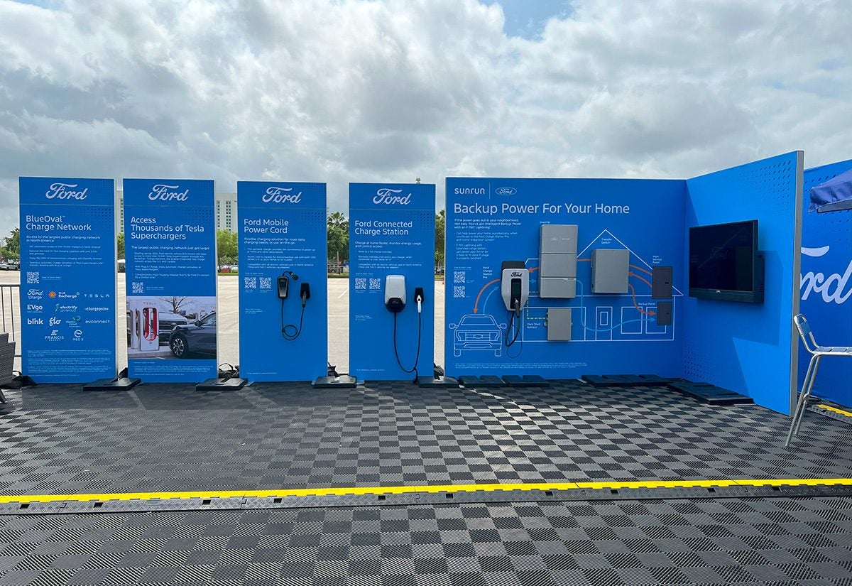 Attendees were drawn into Ford’s completely open footprint by the brand’s F-150 Lightning all-electric truck models and electric blue Mustang Mach-E Rally. Even the booth was powered by an F-150 Lightning. Small branded tents and umbrellas offered shade at tables, and the booth’s segmented backwall showcased Ford’s connected charge station. For a bit of fun, attendees could play a round of cornhole in the Ford booth, but for more of an exhilaration, they could take a hot lap around the nearby Thrill Zone (the site of the tire squealing) in the Mustang Mach-E GT alongside professional drivers.