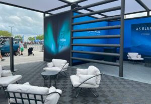 Toyota’s booth featured the most innovative design of the exhibitors, leaning into rounded shapes and a primary color palette to accent columns and wall signage in its largely white build. On a sunny Florida day, attendees appreciated the slanted slats overhead that provided shade while still letting natural light in, especially while waiting in line to spin Toyota’s Beyond Zero wheel. Participants had a chance to come away with a branded fanny pack, water bottle, clear bag or camo print lunch bag, depending on which category they landed on: carbon, materials, biodiversity or water. With each spin of the wheel, a brand ambassador educated attendees on Toyota’s Beyond Zero vision to reach beyond carbon neutrality.