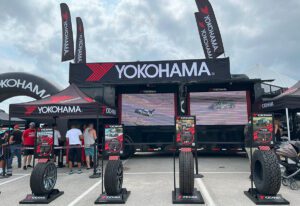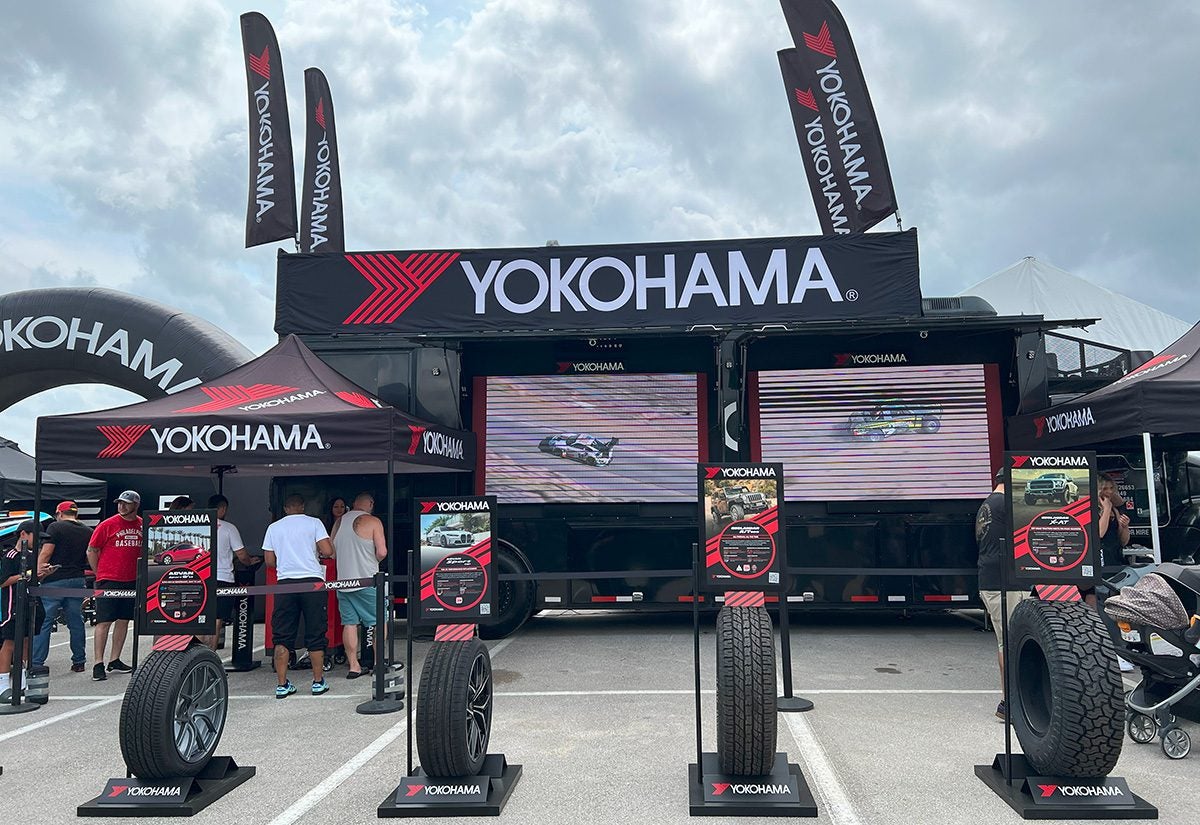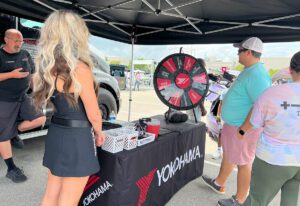 Tire brand Yokohama sponsored the Electrify Showoff, which presented customized EVs ranging from metallic hot pink to Gulf Oil-inspired racing livery. At its own attention-grabbing booth, Yokohama displayed six different types of tires with placards on the cars that use them, along with tall branded banners and an inflatable arch that could be seen from surrounding booths and aisles. Festivalgoers could enter to win a set of four Yokohama tires and then spin a wheel for prizes, including a tire pressure gauge, air freshener, sunglasses, bottle opener, carabiner and lanyard. A trailer served as the booth’s backdrop, with panels that opened up to reveal two large screens playing videos of cars putting Yokohama tires to the test.