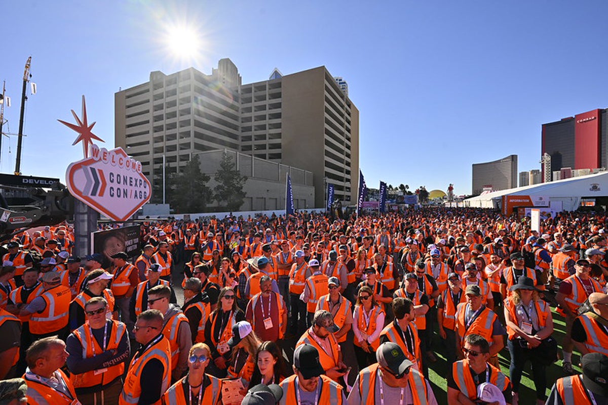 Attendees at the show attempted to beat the Guinness World Record for “Most people wearing high-visibility vests.” Above the headline, the big scene at the LVCC. (Photos: Courtesy of CONEXPO-CON/AGG)