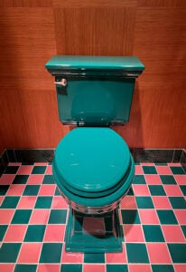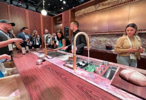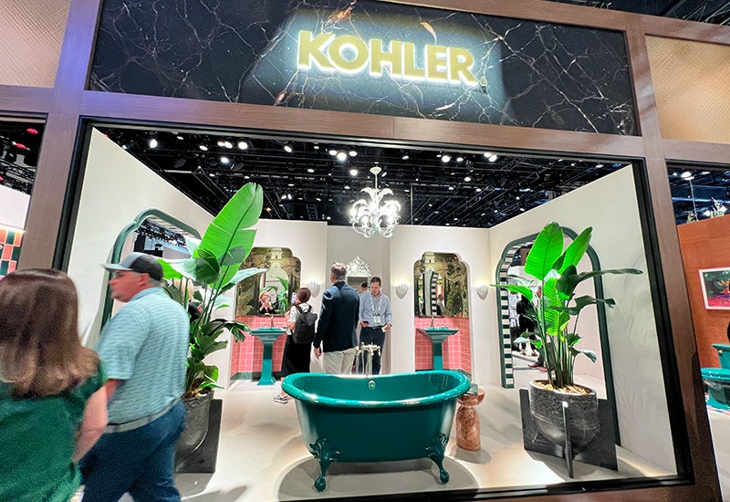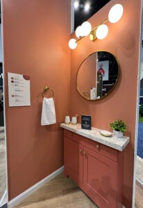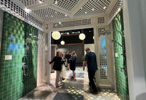Inside, several vignettes took attendees through different lifestyle rooms, ranging from sauna-inspired showers to a mahogany kitchen to a bathroom with a teal toilet, bathtub and sinks against salmon-colored tile—one of the floor’s most popular photo spots.