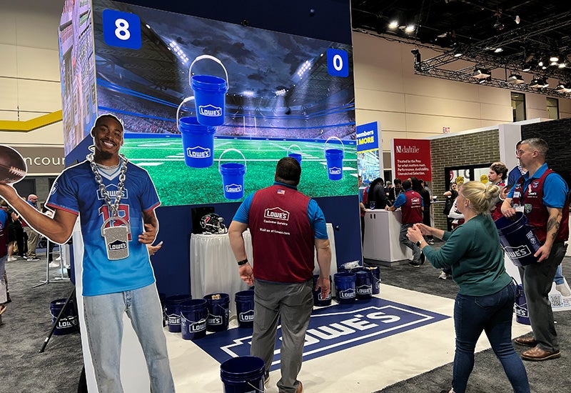 Fresh off its activation at Super Bowl Experience, Lowe’s brought a football-themed booth to IBS, but with a completely different experience from its San Francisco showing. Attendees had a chance to score notebooks, pens, pencils, phone stands and the highly coveted Lowe’s bucket chain by throwing mini foam helmets at a large screen to hit floating buckets. Participants who racked up more than seven points also received a gift card. After missing out on the Lowe’s chain at SBX, we came away with some extra bling.