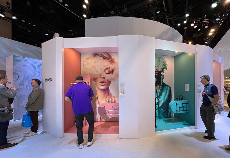 With water-effect lighting from above, Moen transported attendees into a modern oasis, complete with projections, moving graphics and several hues of blue. For pops of color, faucets and fixtures were placed alongside bouquets and in front of backdrops of models styled in monochromatic clothes and accessories that simulated shower bubbles.