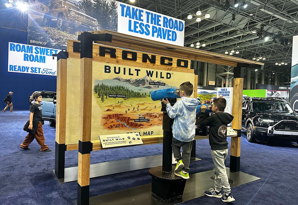 Starting with us stumbling upon a baseball diamond and home base (a carpet pattern that spotlighted the brand’s multiyear partnership with the MLB) in the Ford booth, many of the vehicle specs and touchpoints were intended to be discovered and explored rather than told or displayed on signage. For Ford Bronco, attendees could hop up on a mixed reality vista installation and explore a map through viewfinder binoculars. When pointing the viewfinder at any spot on the map, a mini video would appear, displaying vehicle specs and clips of the vehicle in that environment.