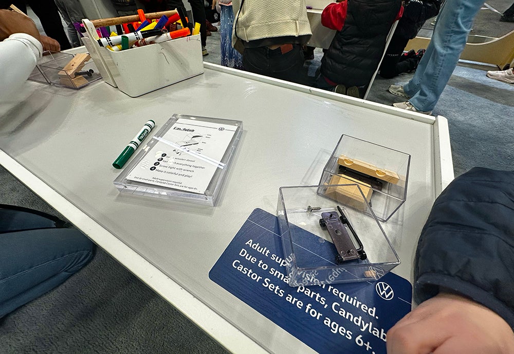 A standout was Volkswagen’s building station, where each child received a wooden kit with an Allen wrench, screw, chassis and vehicle body, that had kids busy assembling and decorating them with markers before racing each other down a wooden track.