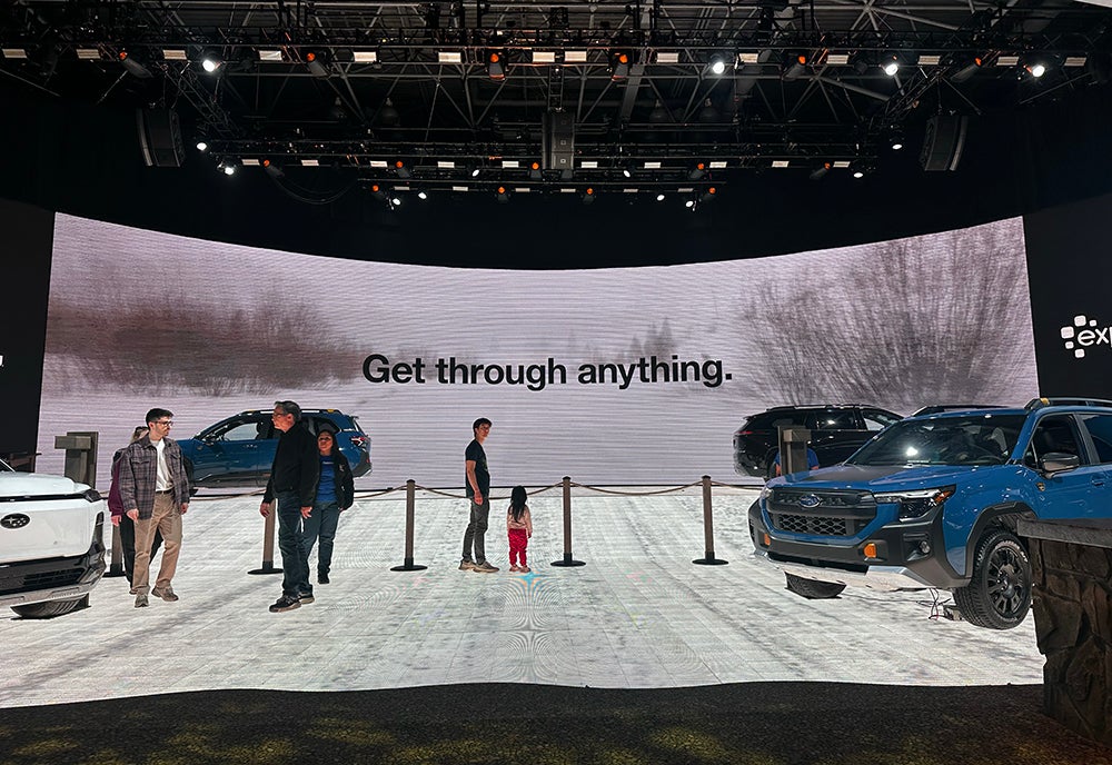 Overall, just as big as the brand names and logos overhead were bold taglines and marketing copy. In the case of Subaru, it was inspirational messaging, from the brand’s signature “Powered by Love” and “More Than a Car Company” taglines to the elegantly powerful “Get through anything” line of copy at the end of the exhibit’s traditional cinematic sequence.