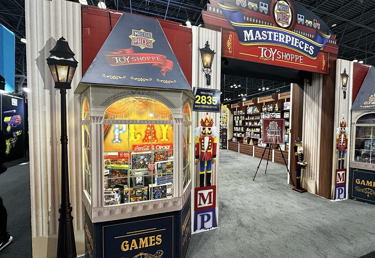 Funko also brought the streetscape vibes with its brick- and mortar-inspired booth and shop windows onlookers couldn’t help but peer into. Red Toolbox’s lamp posts, crosswalk marks, and color-coded product showcases for its licensed made-for-kids lines was as eye catching as it was efficient, with business conducted from bistro tables at the center. And puzzle maker Masterpiece’s cardboard material exhibit was made to look like an antique toy shop, complete with lighted windows—light weight and effective.