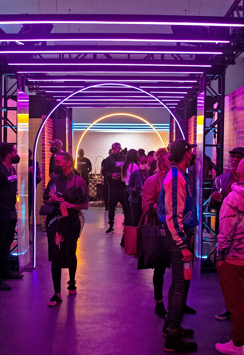 As part of the Saint’s on Crenshaw marketplace, attendees were invited to take part in a neon-lit “Always About Business” desk photo op. Inside, they could interact with local business owners and shop fashion, décor, jewelry and plants, then refuel with grab-and-go snacks and beverages from Hank’s Mini Market, Harun and Crenshaw Juice Co.