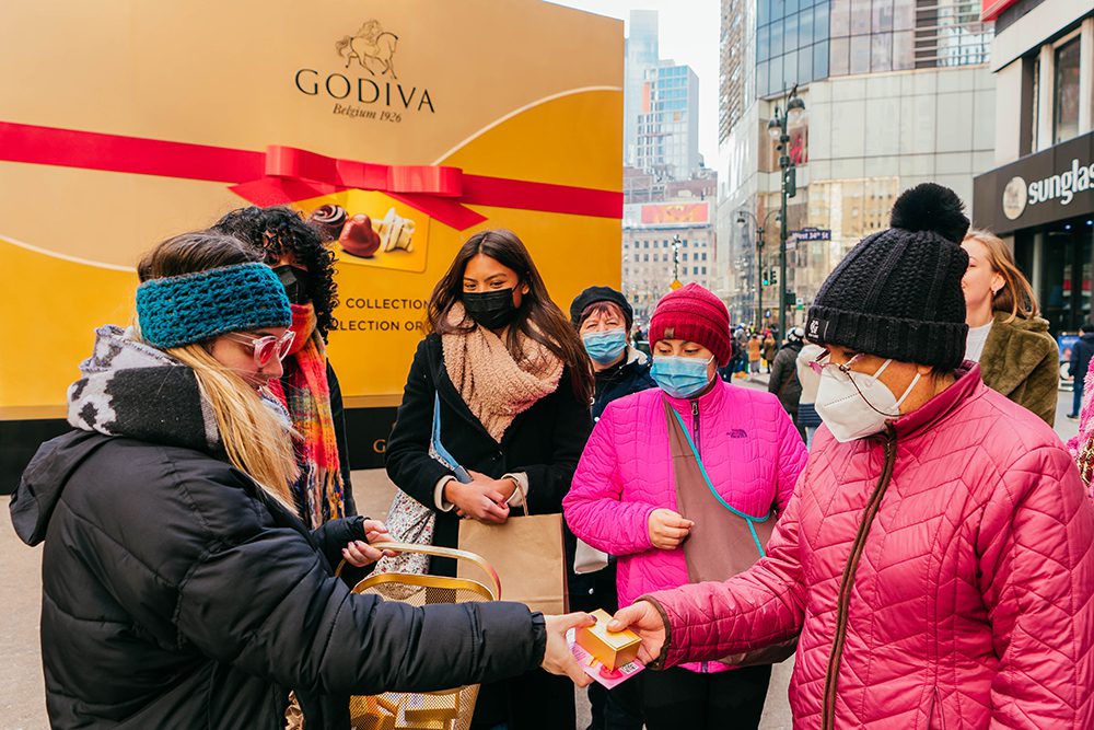Leading up to the chocolate box activations, Godiva teased their geographic locations on social media. First, the brand’s iconic square gold chocolate box came to life in the form of a 20-foot by 24-foot photo op in Herald Square on Feb. 8, illuminated by LED lighting and staffed with brand ambassadors who handed out complimentary chocolate. The next day, Feb. 9, the brand unveiled a 20-foot by 14-foot Godiva heart chocolate box installation in Flatiron Plaza, which was significant because while the box has been available to consumers for a few years now it is becoming more wildly available in major retailers from Target to Costco.