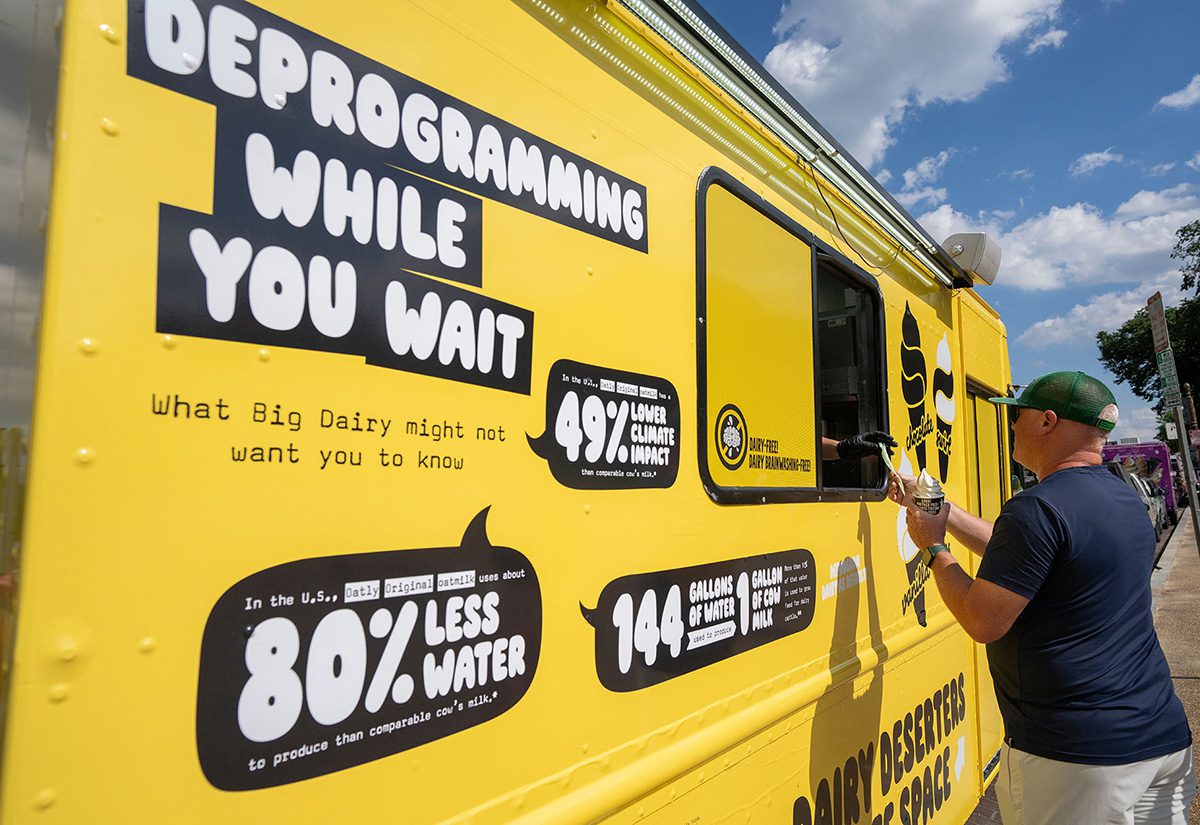 Messaging was key for the stunt. The truck’s exterior was covered in climate impact facts and stats (“what Big Dairy might not want you to know”), and matching A-frame signage featured phrases like “Dairy Debrain-washing Station” and “Former dairy converts welcome!” For the design, Oatly wanted something attention-grabbing to draw Capitol Hill Ice Cream Party attendees from across the street. Bright yellow and black with hints of white gave the truck and signage a “caution tape kind of vibe” that had D.C. locals and tourists doing a double take.