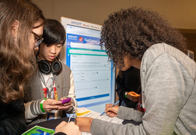 “The panel is a great way for them to hear about the topic in a way that’s relatable, and this is important because the kids get to see someone who might look like them, have a background similar to them, can speak to them in a credible way and have personal stories that they could relate to,” says Dave Zasada, vp-education and corporate responsibility at Intuit. “Then, they go through these breakout sessions where they’re not sitting in chairs getting talked to. It’s all very interactive. In one session, they’re using their own phones, which they were shocked that they were even allowed to bring their phones to an education event, let alone actually use them.”