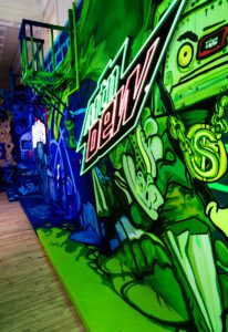 Fans who visited The Block encountered a space brimming with both Mtn Dew and Ruffles’ iconic branding, including ample neon green and blue lighting. On-site, they could grab a seat in a dedicated gaming lounge and check out an NBA 2K gaming installation. They could also admire featured artwork created by artists Glen Infante and Aldonte Flonnoy, and muralist Isaiah Williams (and create social content using the designs as backdrops).