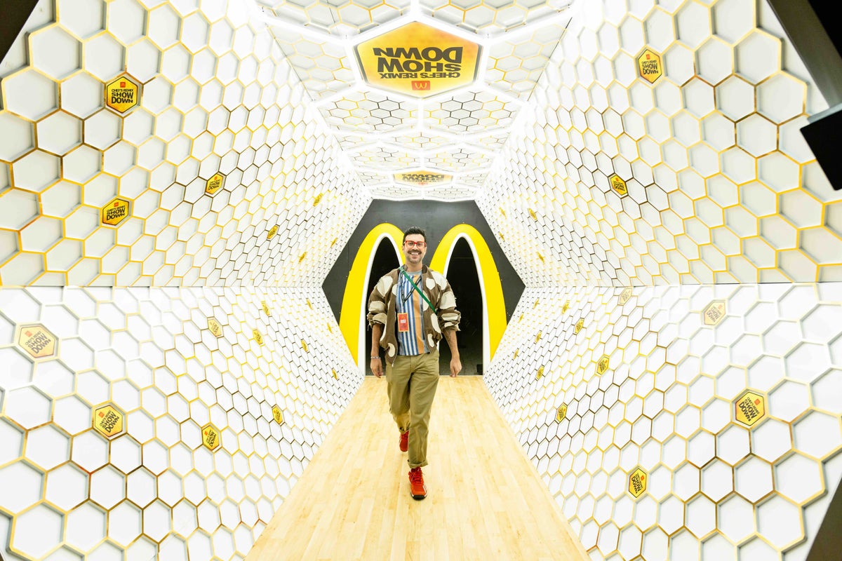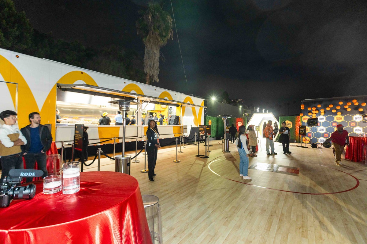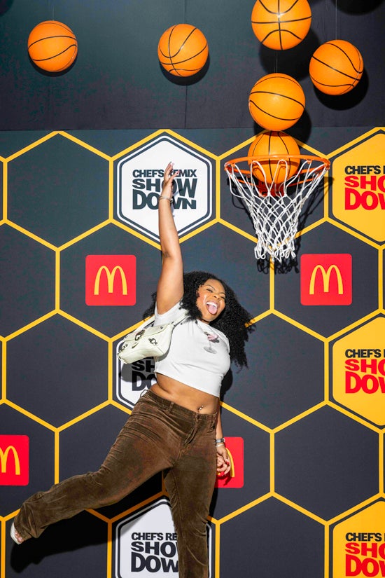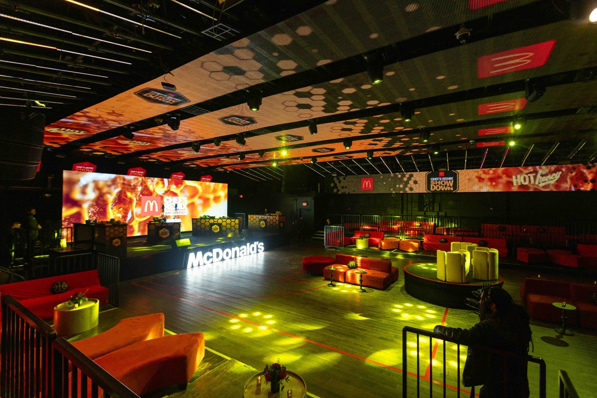 On Feb. 12, McDonald’s welcomed almost 1,000 attendees to the 2026 Chef’s Remix Showdown at The Academy in Hollywood. Oversized illuminated Golden Arches greeted them at the entrance, and they then moved into a white honeycomb tunnel with basketball court-inspired flooring, leading to a social content-capture moment tied to the new Hot Honey Sauce and McCrispy Strips. The Hot Honey theme permeated the venue design with honeycombs appearing across signage and bars.