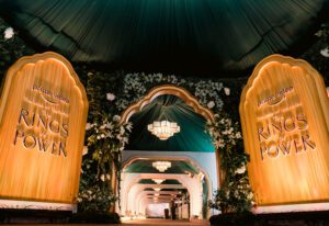 In L.A., for instance, Prime Video’s premiere and screening experience was followed by an after-party for VIPs and press. On their way to the soiree, attendees strolled down a walkway lined with black and white imagery of the cast encased in illuminated frames etched in “Elvish.” Then, their attention was directed to the skies, where more than 300 drones put on a show displaying symbolism from the series before dramatically wrapping with Prime Video’s logo. The experience even became a trending topic on Twitter.