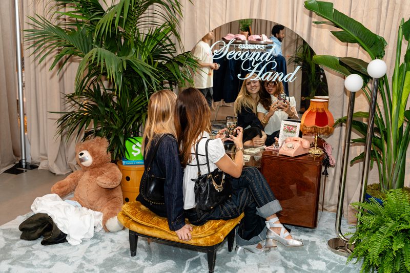 Attendees could also pose in one of several photo vignettes, including a baby blue shag carpet wall with the “Sabrina’s Second Hand” logo on it, a vintage bedroom vanity, a couch shaped like red lips, a retro photo booth and a neon sign that read “Please Please Please,” a reference to one of her songs.