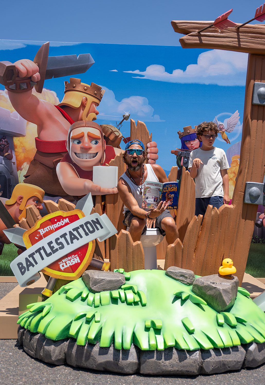 The Battlestation was a mix of spectacle and utility. The setup included fully functioning toilets within stalls equipped with “2-in-1 raid and recharge” stations and Wi-Fi access. Each stall featured printed graphics inspired by Clash battlegrounds, which became popular photo ops. There was also an outhouse photo moment featuring a Clash of Clans twist.