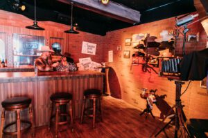 The Village hosted several popular activations, particularly two related to the “Yellowstone” franchise. In the “1923” Silver Dollar Soda Shop, fans donned cowboy hats and scarves for an old-timey, sepia photo op at the bar, and outside, they could hold up Prohibition-era signage, such as “Alcohol is poison.” The longest line we encountered was to get custom “Yellowstone”-branded can coolers monogrammed by a laser engraver and then proudly display the leather-looking swag in front of a barn emblazoned with the show’s signature “Y” logo surrounded by hay and horse saddles.